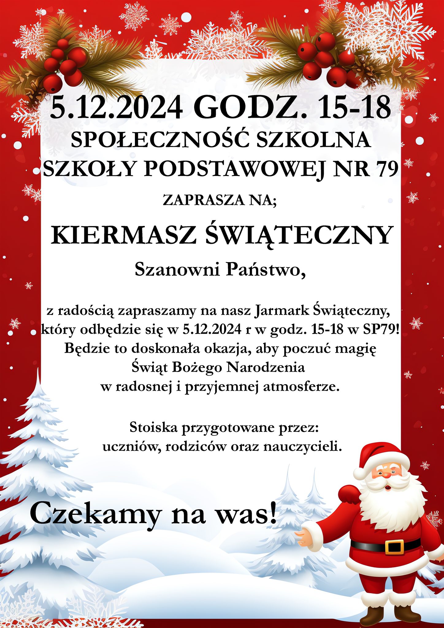 Serdecznie zapraszamy wszystkich chętnych na Jarmark Bożonarodzeniowy, który odbędzie się 05.12.2024r. w godz. 15:00 – 18:00 w naszej szkole.
