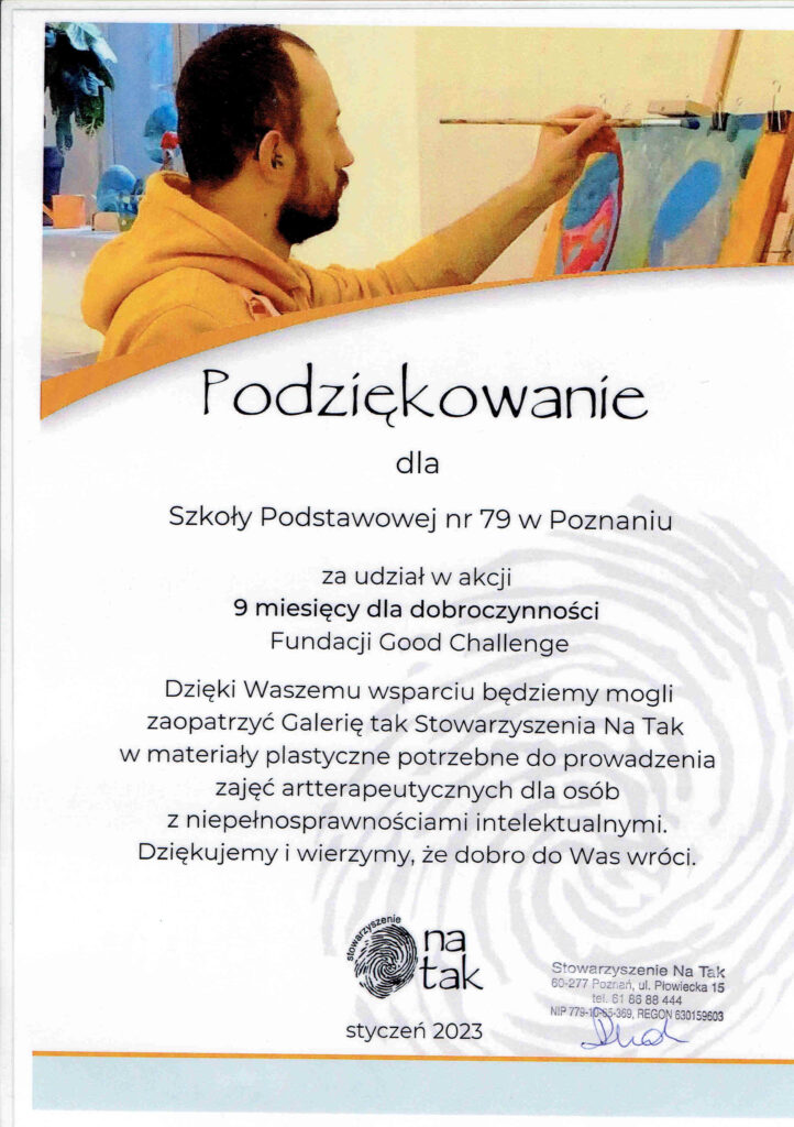 PODZIĘKOWANIE 27 lutego, 2023ak Nasza szkoła otrzymała specjalne podziękowanie za udział w akcji 9 miesięcy dobroczynności Fundacji Good Challenge.