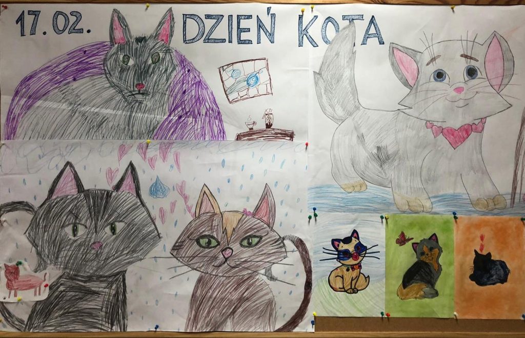 17 lutego świetlica szkolna obchodziła Dzień Kota. Z tej okazji uczniowie przyszli do szkoły w koszulkach z wizerunkiem przeróżnych kotów a wraz z wychowawcami świetlicy wykonali gazetkę ścienną.