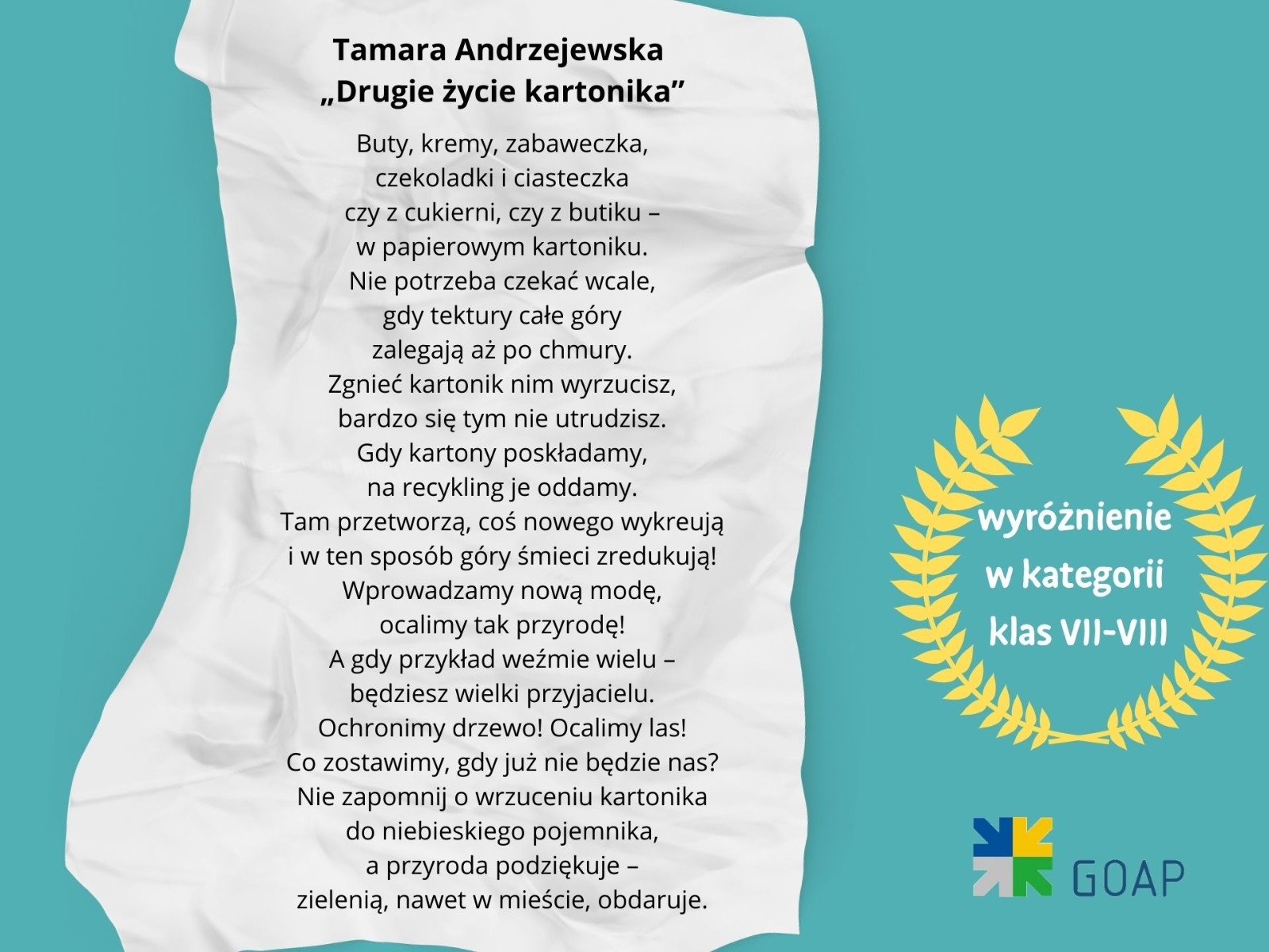Miło nam poinformować, że uczennica naszej szkoły Tamara Andrzejewska z klasy 8b otrzymała wyróżnienie w konkursie zorganizowanym przez GOAP z okazji Dnia Ziemi pn. „Segreguję odpady – działam EKOlogicznie”. Prace oceniano w trzech kategoriach wiekowych. Nadesłano aż 137 prac konkursowych .