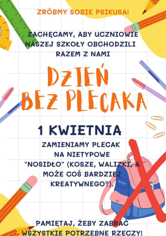 Dnia 1 kwietnia zachęcamy uczniów naszej szkoły, aby obchodzili razem z nami “Dzień bez plecaka”. Tego dnia zamieniamy plecaki na nietypowe “nosidło” (kosze, walizki, a może coś bardziej kreatywnego?)