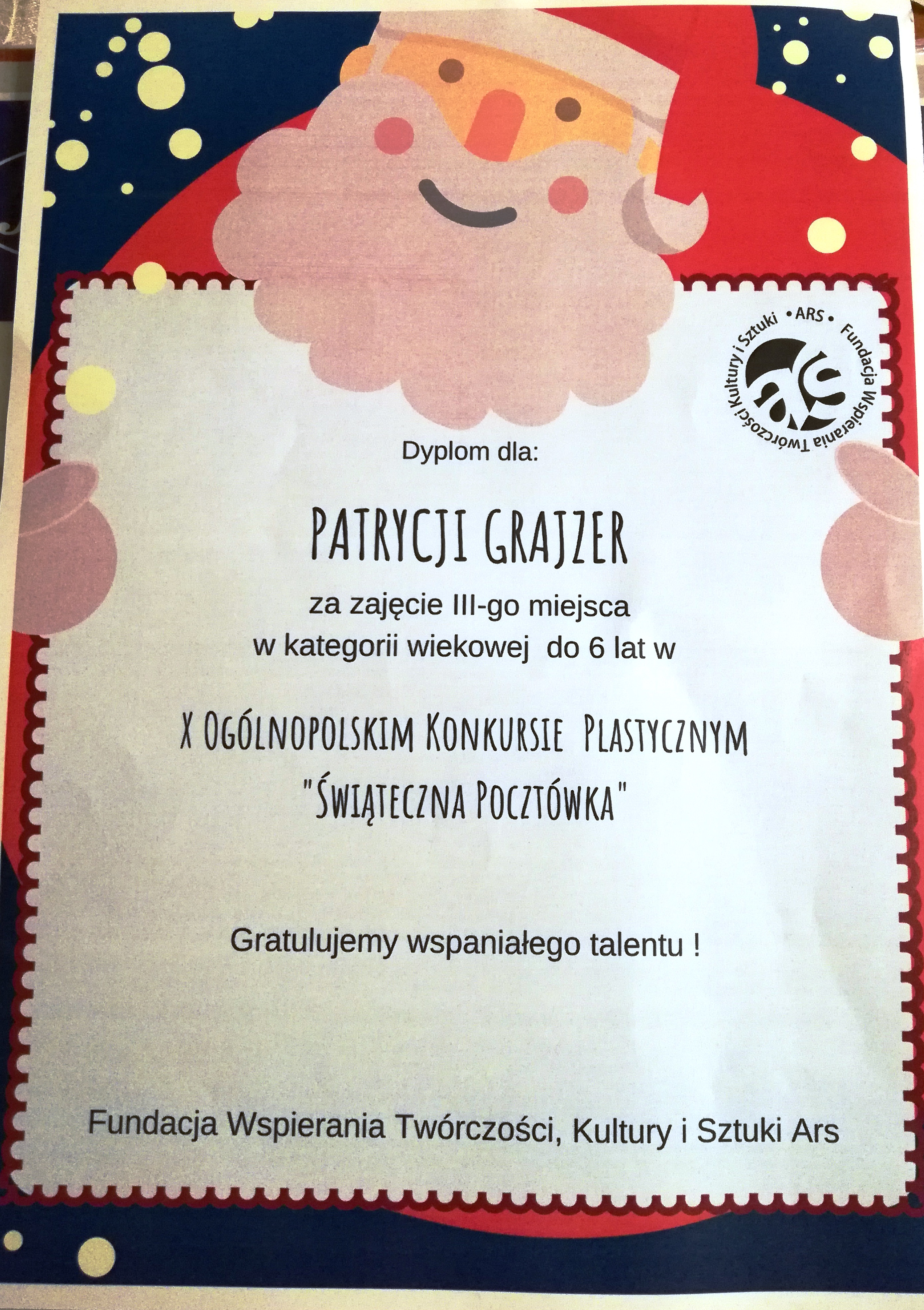 Patrycja Grajzer z oddziału przedszkolnego zajęła III miejsce w kategorii wiekowej do lat 6 w X Ogólnopolskim Konkursie Plastycznym „Świąteczna pocztówka” zorganizowanym przez Fundację Wspierania Twórczości, Kultury i Sztuki. W konkursie udział wzięło kilka tysięcy prac z wielu szkół i przedszkoli z całej Polski. Dnia 18 grudnia w siedzibie fundacji odbyło się uroczyste wręczenie nagród. Zwycięskie prace zostały wydrukowanie w postaci prawdziwych pocztówek, gotowych do wysłania.